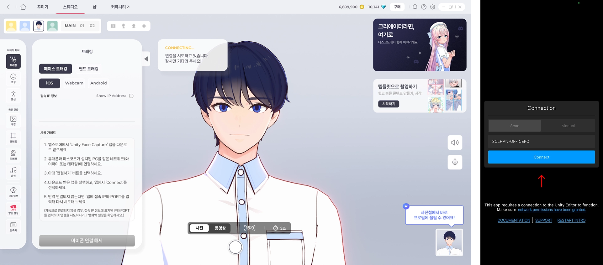 다시 휴대폰에서 Unity Face Capture 앱을 실행하고 “Connect”를 선택하세요.