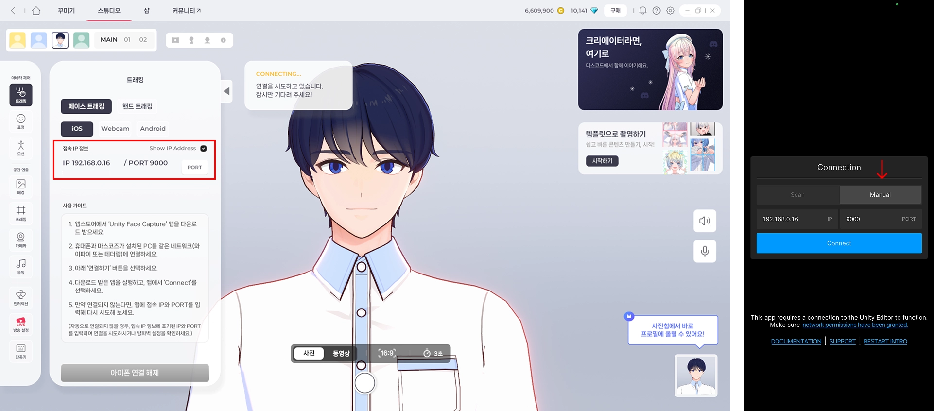 Unity Face Capture 앱에서 와이파이를 찾지 못하고 있다면, 마스코즈에서 Show IP Address를 체크해 주세요. 이 IP와 PORT를 앱에 수동으로 입력해 보세요.