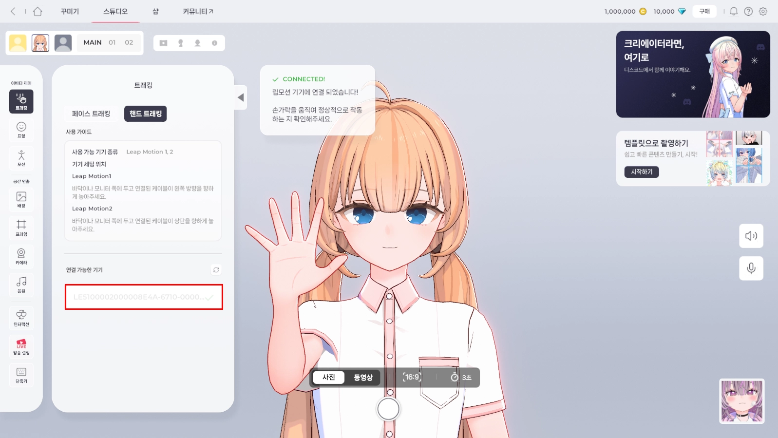 페이스 트래킹 연결을 완료했다면, 핸드 트래킹도 연결할 수 있어요. 반드시 페이스 트래킹을 먼저 연결한 후, 핸드 트래킹을 연결해 주세요. 마스코즈에서는 립모션(LeapMotion)만 지원해요.