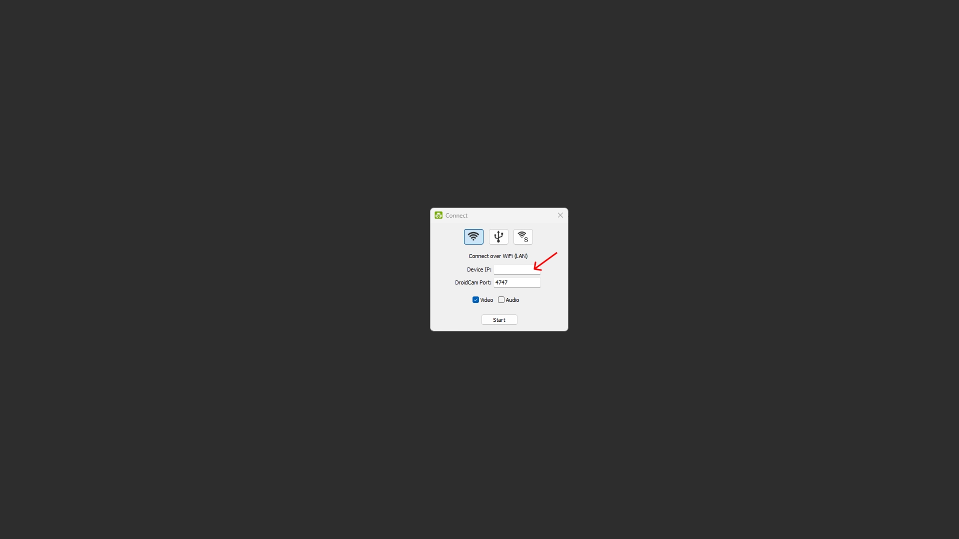 PC에서 DroidCam 프로그램을 실행하세요. 휴대폰 앱의 와이파이 IP를 PC의 “Device IP”에 입력하고 “Start”버튼을 누르세요.