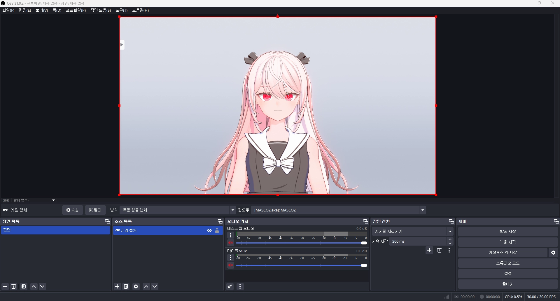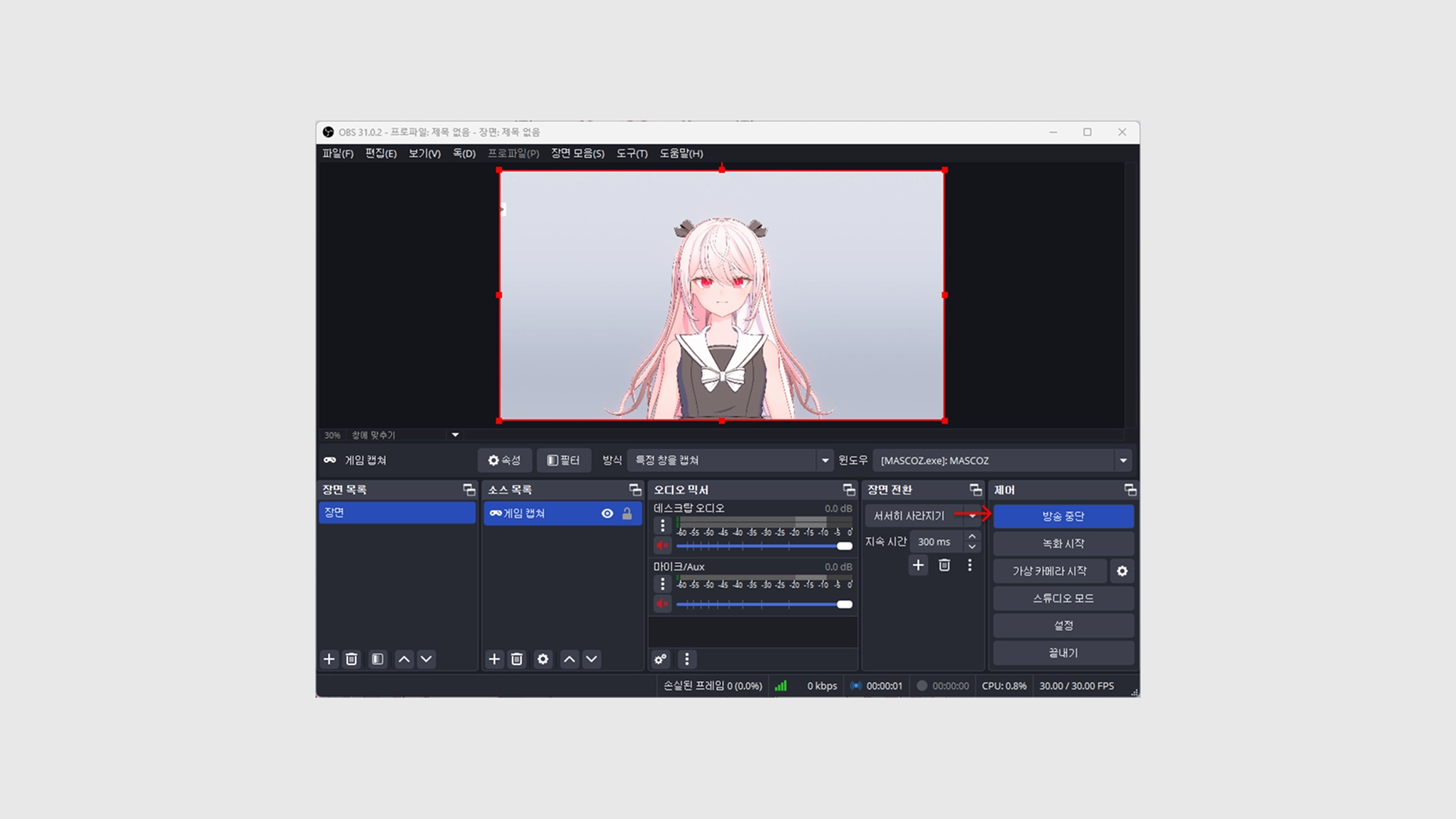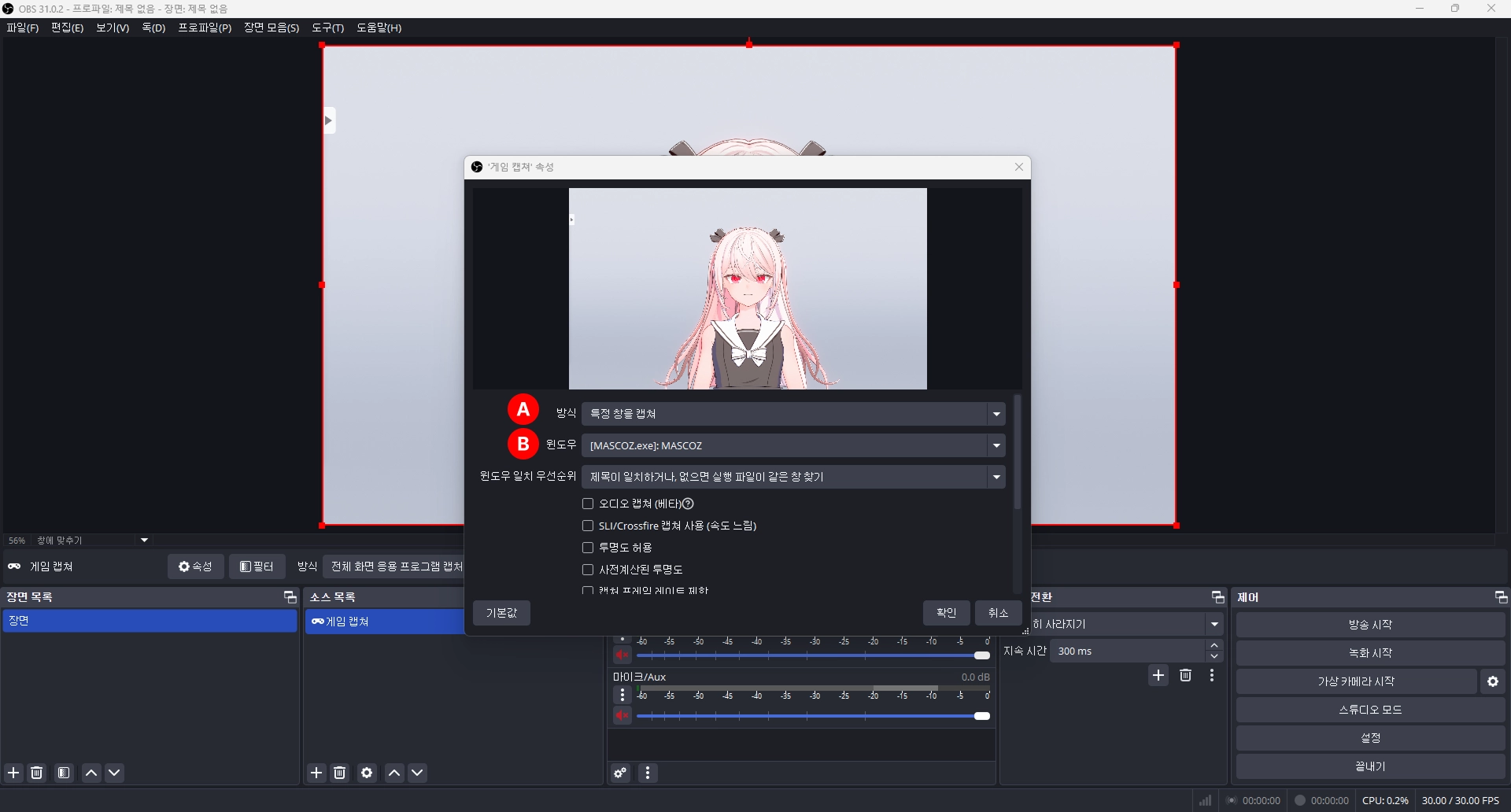게임 캡쳐 속성에서 “특정 창을 캡쳐”로 바꾸고, 윈도우에서 Mascoz.exe(마스코즈 실행 창)을 선택하세요.