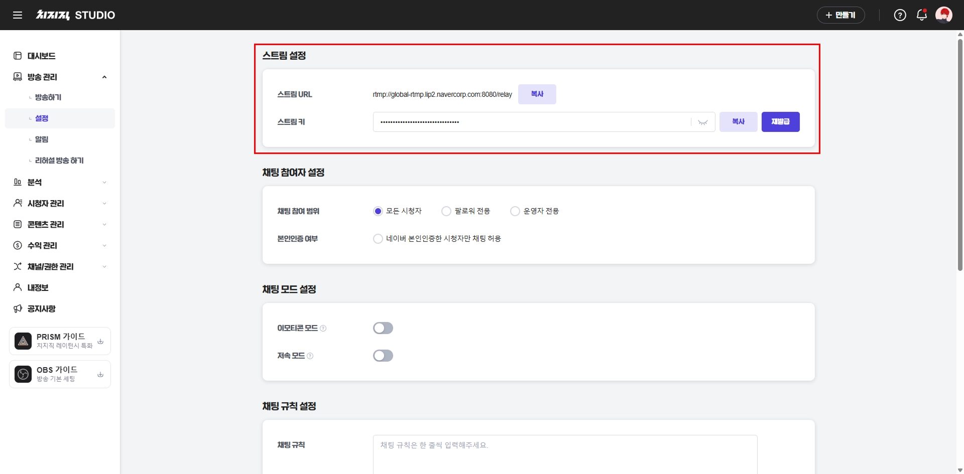 방송 플랫폼에서 스트림 URL과 스트림 키를 복사하세요.