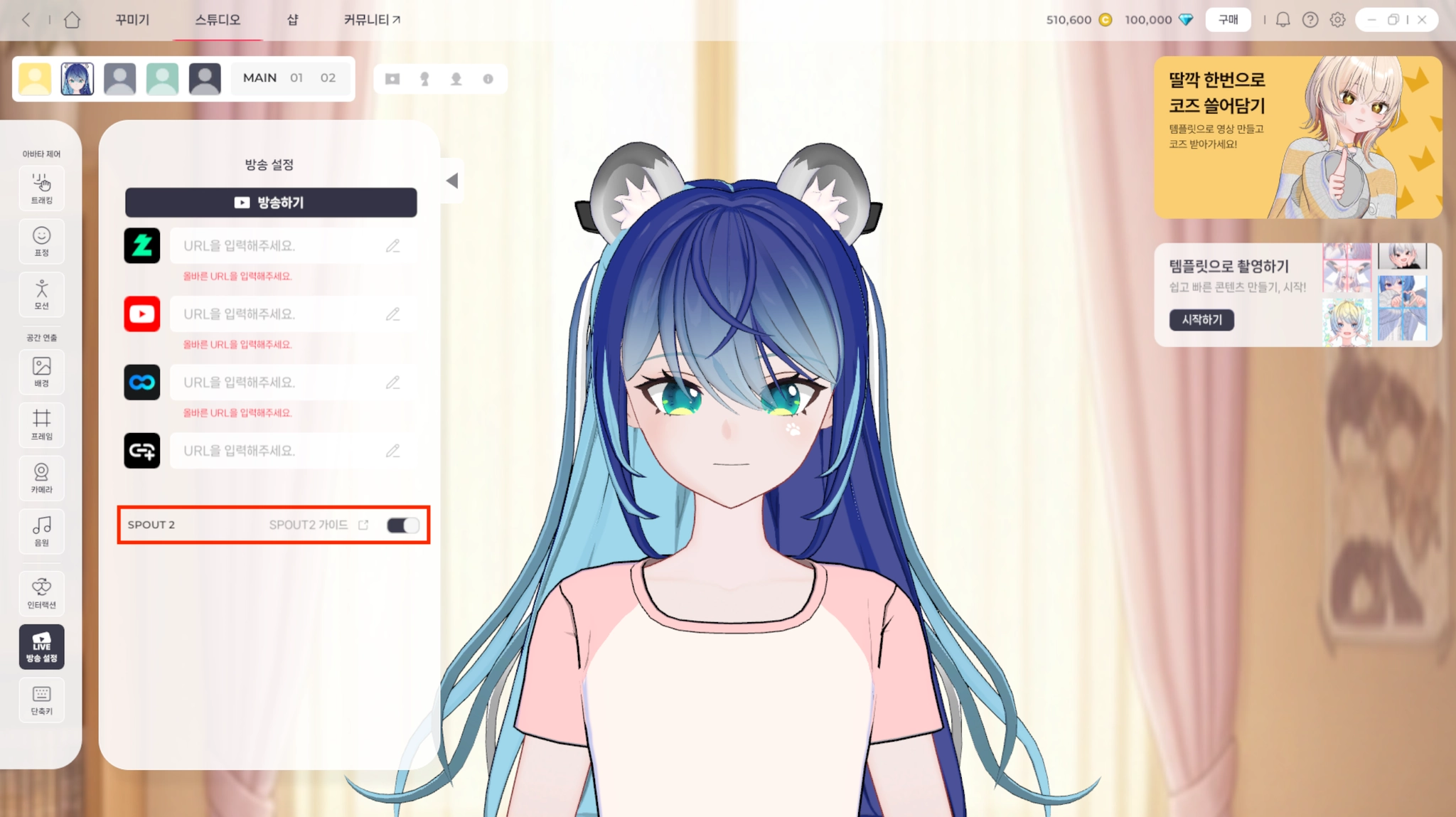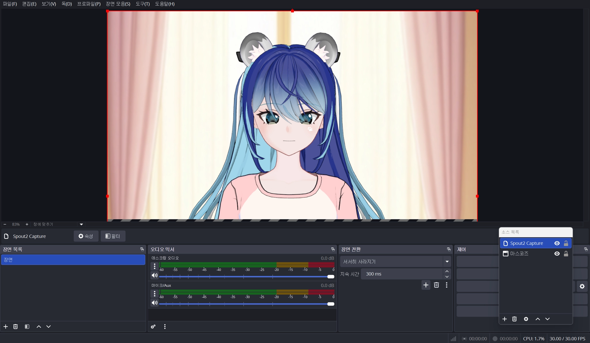 마스코즈 실행 → 스튜디오 → 방송 설정 → SPOUT2