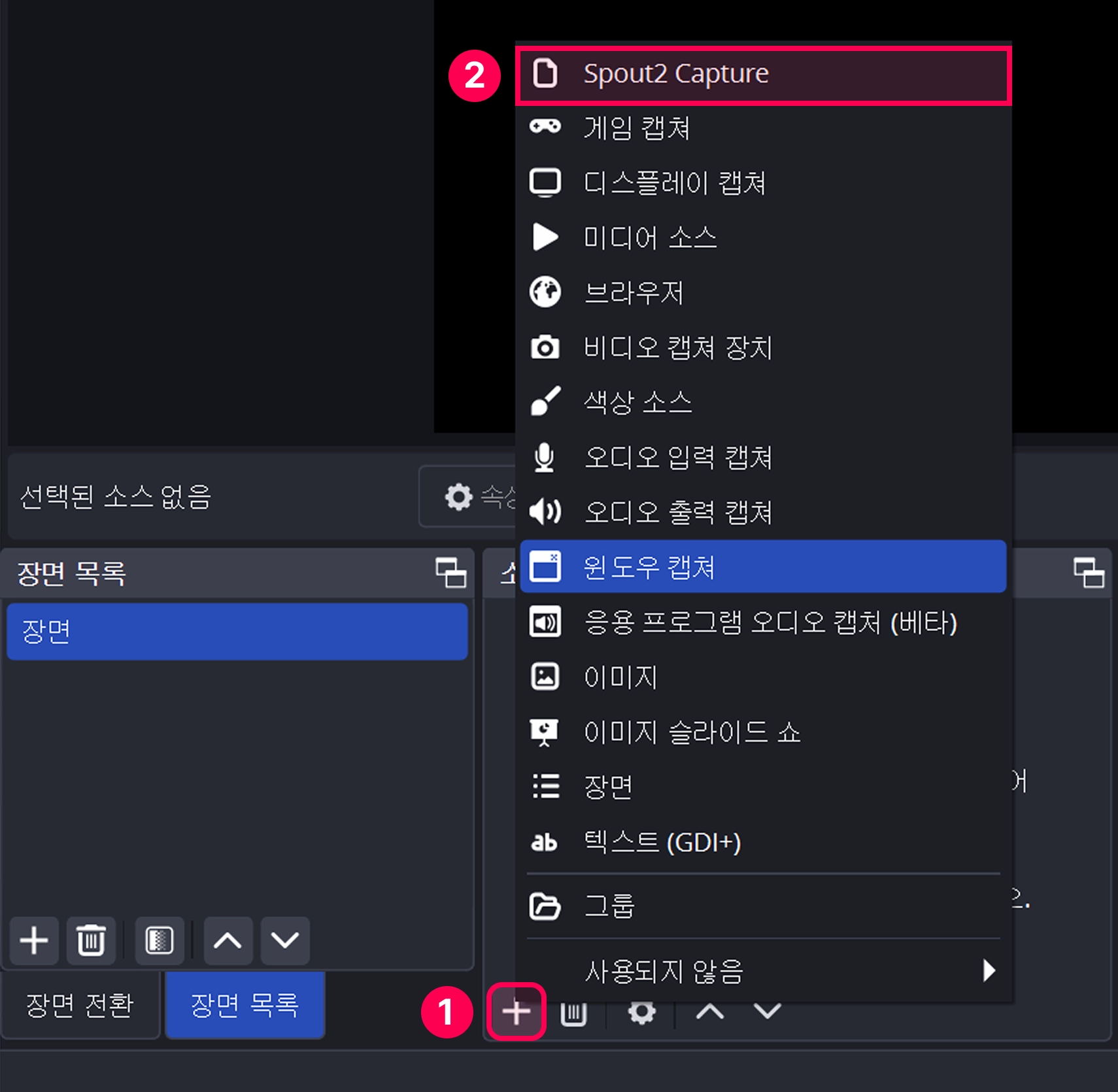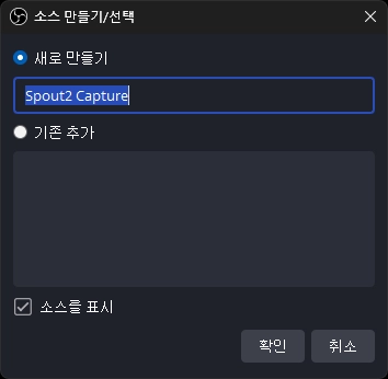 소스 목록 → Spout2 Capture 선택 → 소스 만들기