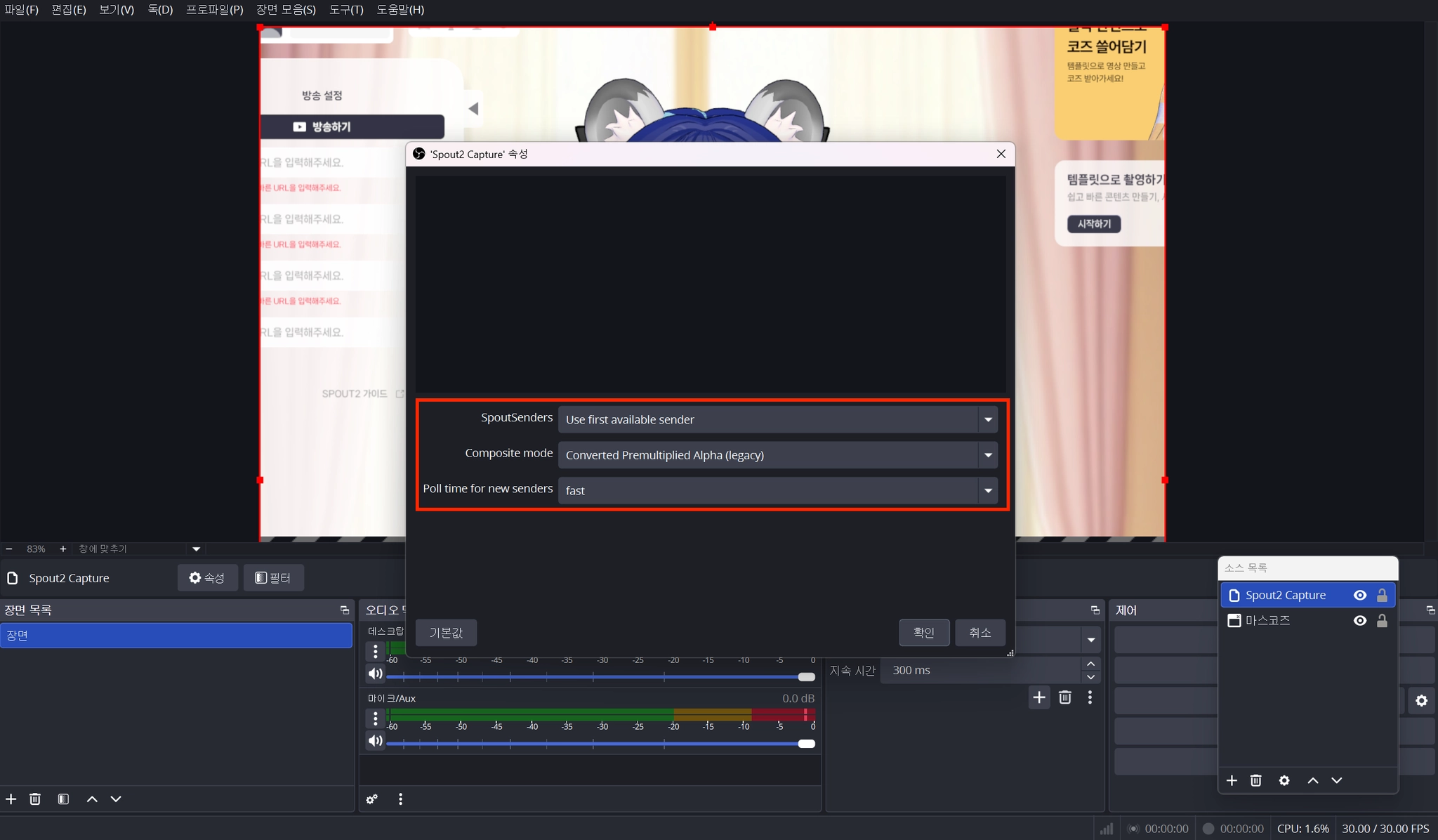 Spout2 Capture의 속성을 아래와 같이 설정하고 확인을 눌러주세요.